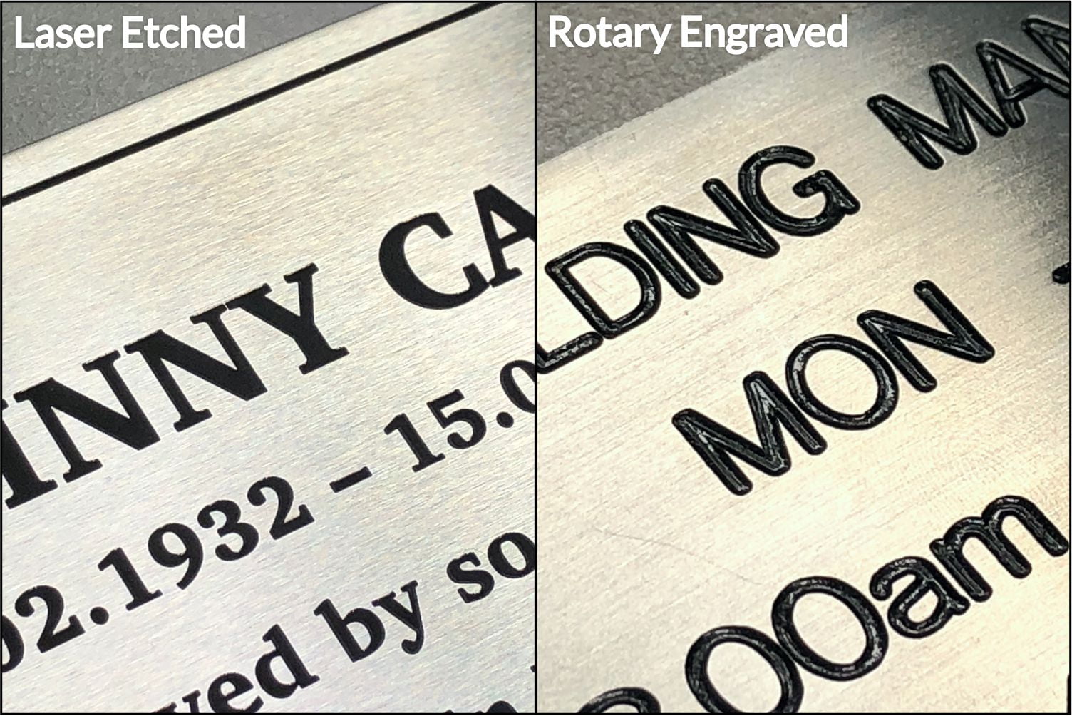 Rotary engraving uses a rotating cutting tool. The tool cuts deep enough into the material so it can be paint filled later with soft enamel paint. This is used mainly on brass or stainless steel where the customer wants coloured text.